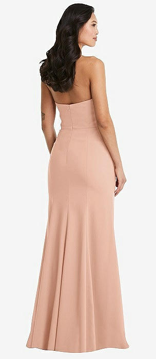 Strapless Pleated Faux Wrap Trumpet Gown with Front Slit in pale peach