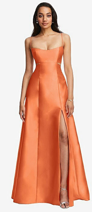 Boned Corset Closed-Back Satin Gown with Full Skirt and Pockets in portofino orange