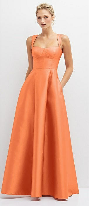 Boned Corset Closed-Back Satin Gown with Full Skirt and Pockets in portofino orange