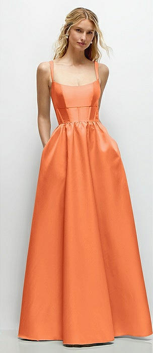 Scoop Neck Inset Corset Satin Maxi Dress with Pockets in portofino orange