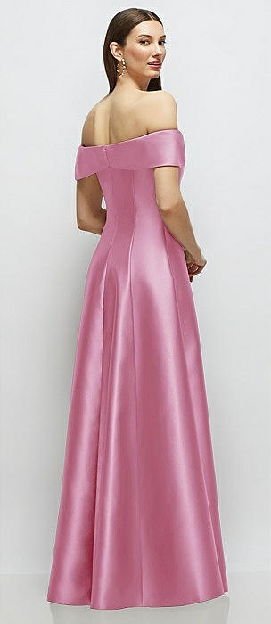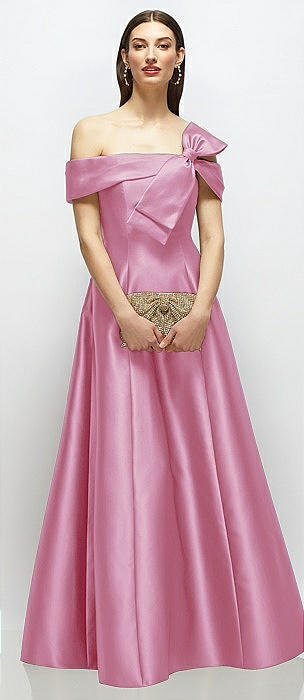 Asymmetrical Bow Off-Shoulder Satin Gown with Ballroom Skirt in powder pink