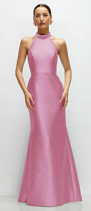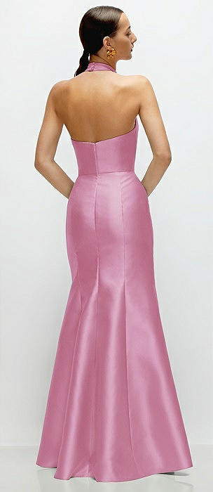 High-Neck Halter Open-Back Satin Trumpet Dress in powder pink