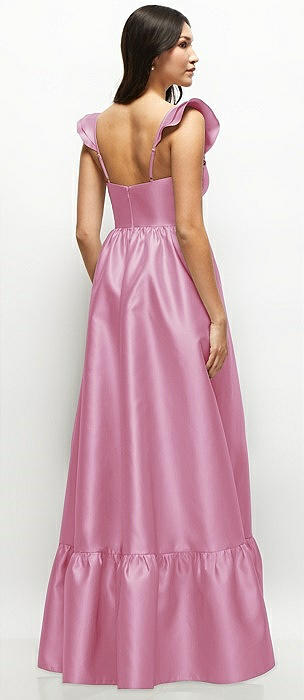 Bow-Shoulder Satin Maxi Dress with Asymmetrical Tiered Skirt in powder pink