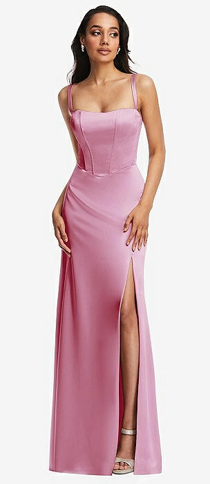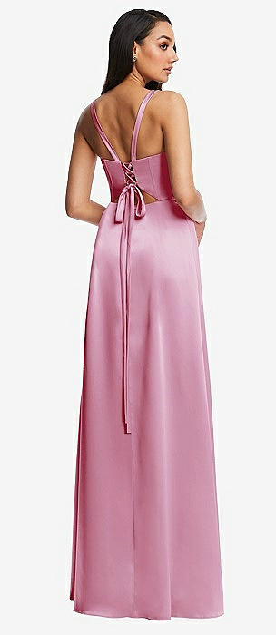 Lace Up Tie-Back Corset Maxi Dress with Front Slit in powder pink