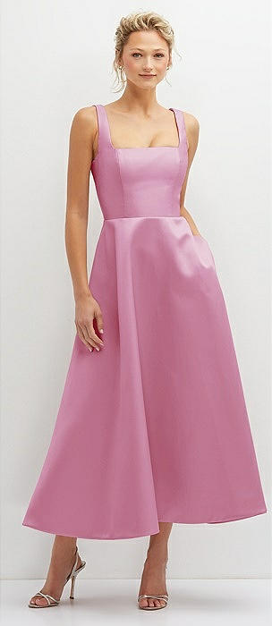 Square Neck Satin Midi Dress with Full Skirt & Pockets in powder pink