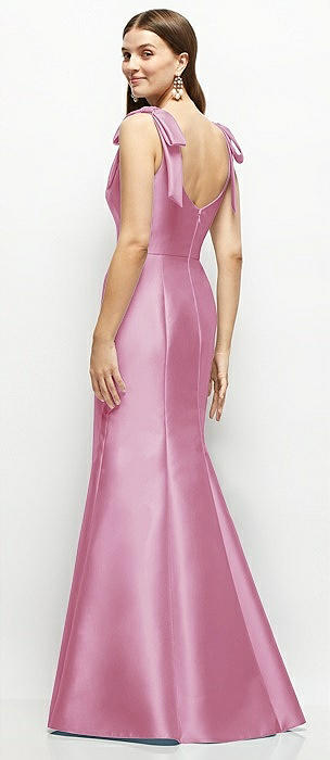 Deep V-back Satin Trumpet Dress with Cascading Bow at One Shoulder in powder pink