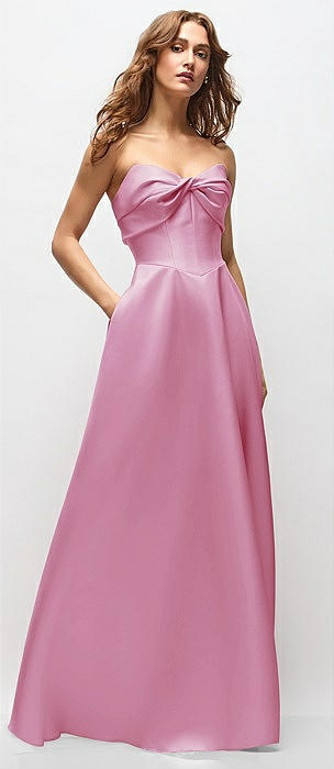Strapless Bow-Waist Satin Column Dress with Overskirt in powder pink