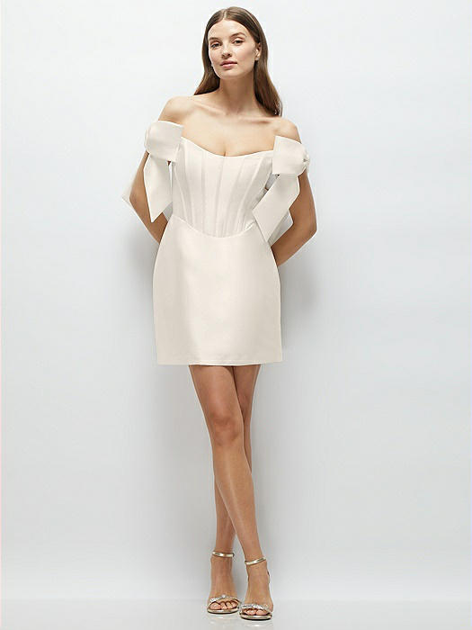 Satin Off-the-Shoulder Bow Corset Fit and Flare Mini Dress in ivory