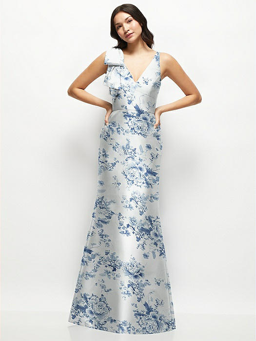 Deep V-back Floral Satin Trumpet Dress with One-Shoulder Cascading Bow in cottage rose larkspur