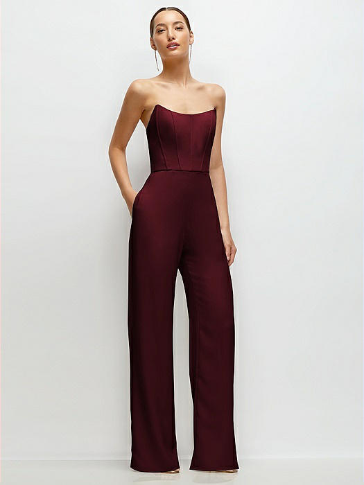 Strapless Cat-Eye Corset Crepe Wedding Jumpsuit in cabernet