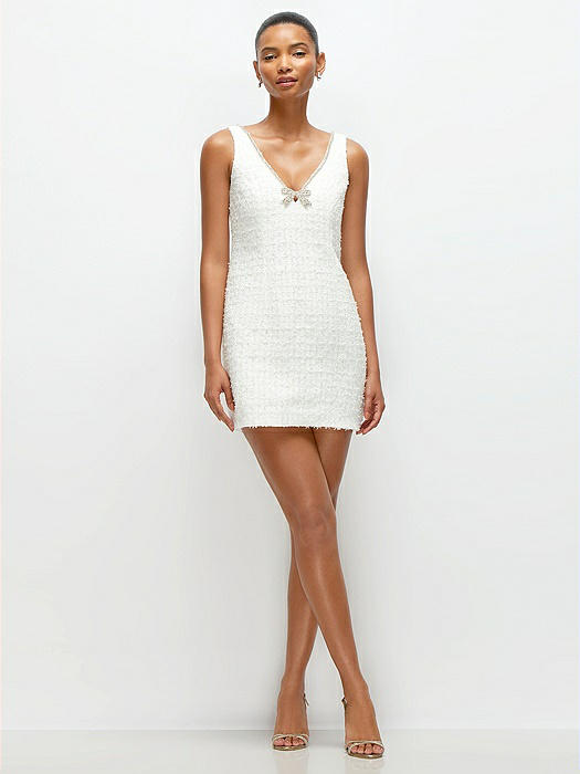 Sleeveless Luxe Bridal Tweed Mini Sheath Dress with Rhinestone Trim in ivory shimmer