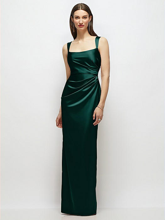 Scoop Neck Draped Column Stretch Satin Maxi Dress in evergreen