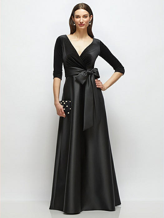 3/4 Sleeve Wrap Bodice Full Skirt Black Velvet and Satin Dress with Sash in black