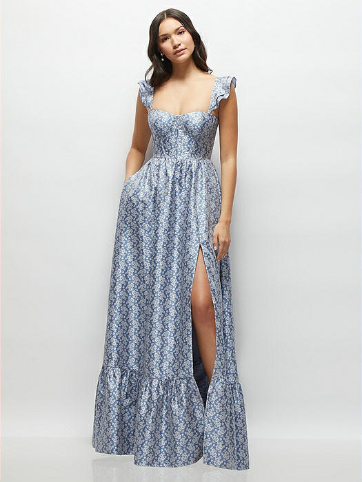Marguerite Floral Corset Maxi Dress with Ruffle Straps & Skirt in chambray