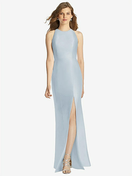 Shirred Skirt Jewel Neck Halter Dress with Front Slit in larkspur blue