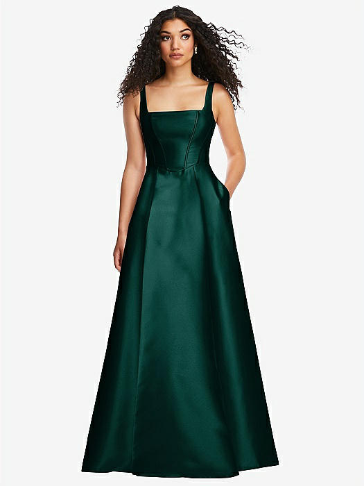 Boned Corset Closed-Back Satin Gown with Full Skirt and Pockets in evergreen
