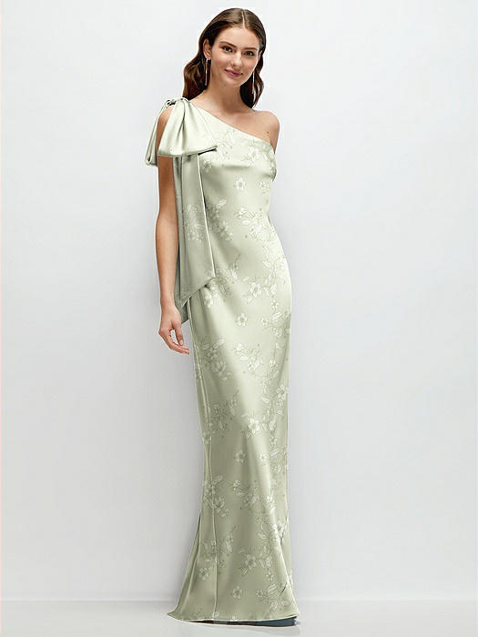 One-Shoulder Bias-Cut Floral Satin Maxi Dress with Cascading Shoulder Bow in vintage primrose celadon