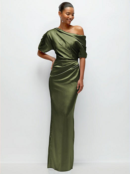 Asymmetrical Off-the-Shoulder Pleated Satin Maxi Dress in olive green