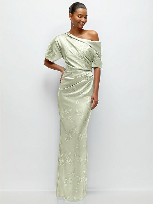 Asymmetrical Off-the-Shoulder Draped Floral Satin Maxi Dress in vintage primrose celadon