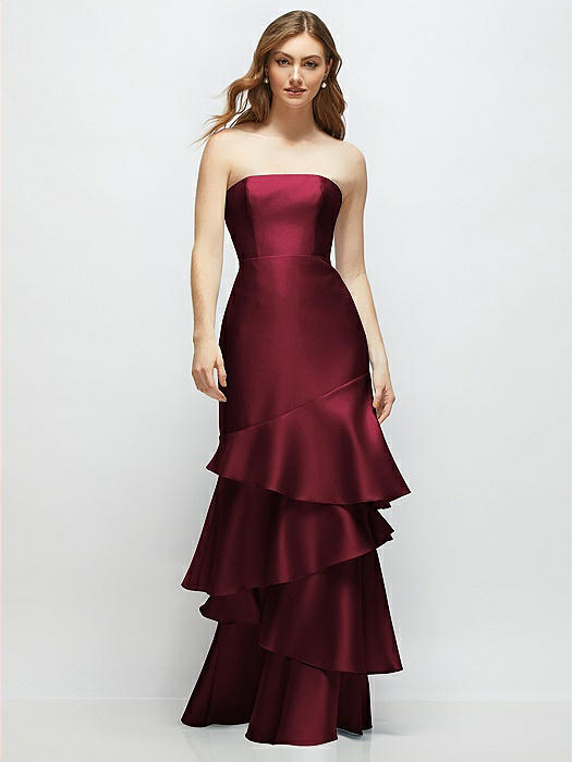 Strapless Bodycon Maxi Dress with Tiered Ruffle Skirt in cabernet