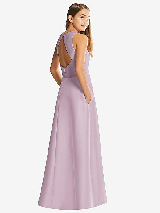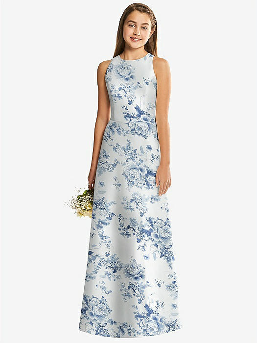 Floral Sleeveless Open-Back Satin Junior Bridesmaid Dress in cottage rose larkspur