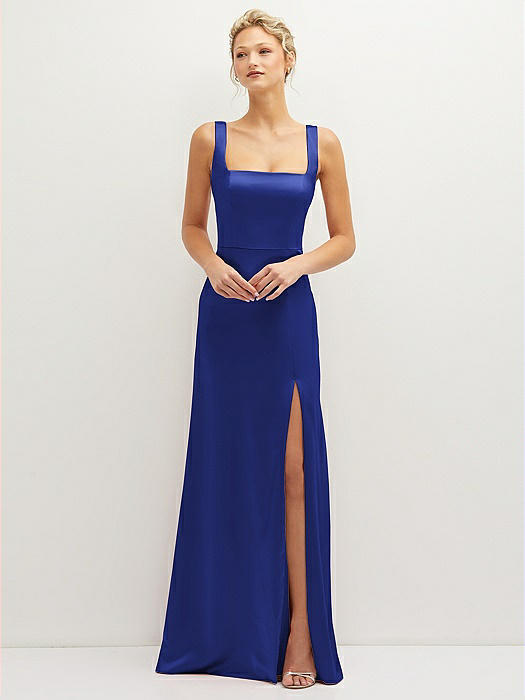 Square-Neck Satin A-line Maxi Dress with Front Slit in cobalt blue