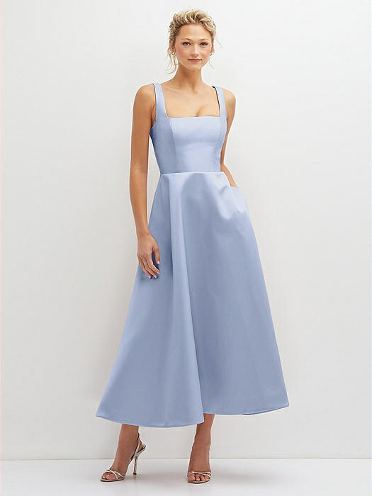Square Neck Satin Midi Dress with Full Skirt & Pockets in sky blue