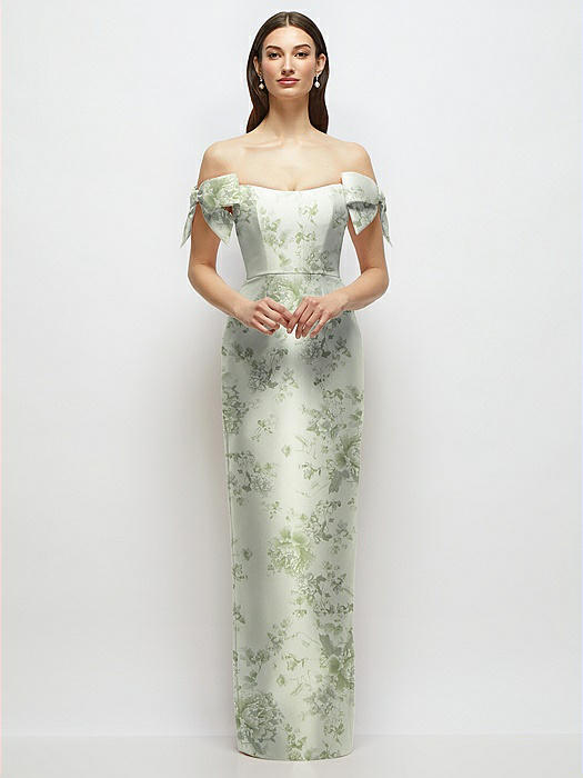 Basque-Neck Floral Satin Column Maxi Dress with Off-the-Shoulder Bows in sage cottage rose