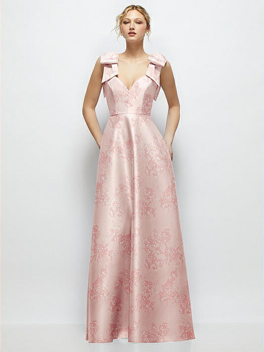 Deep V-Neck Floral Satin Ball Gown with Shoulder Bows in bow and blossom print