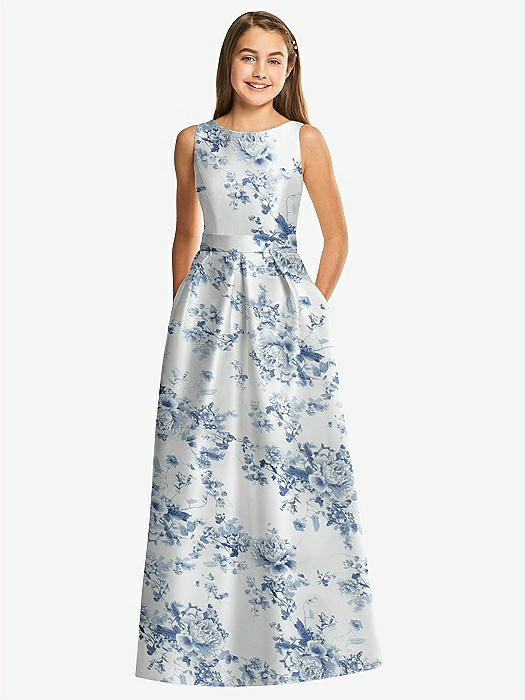 Floral Bateau Neck Maxi Junior Bridesmaid Dress with Pockets in cottage rose larkspur