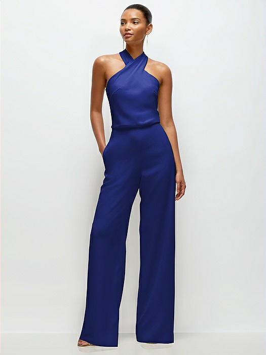 Pleated Halter Blouson Crepe Wedding Jumpsuit with Self-Tie Bow Back in cobalt blue