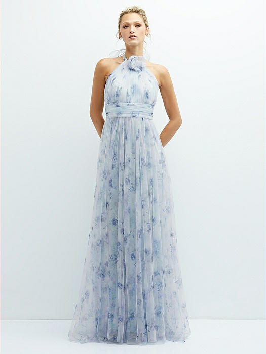 Floral Tie-Back Halter Tulle Dress with Long Full Skirt & Rosette Detail in mist garden