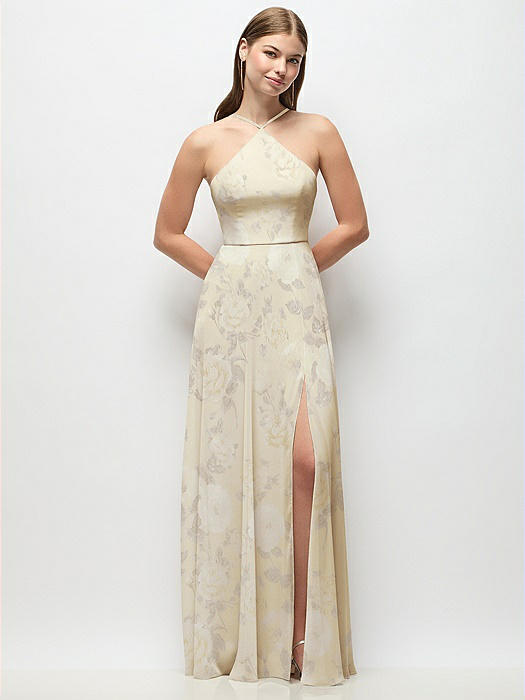 High-Neck Halter Floral Chiffon Maxi Dress with Adjustable Spaghetti Straps in butter yellow floral