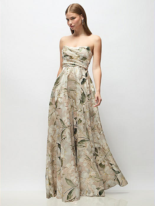 Strapless Draped Bodice Floral Stretch Satin Column Maxi Dress in vintage primrose celadon