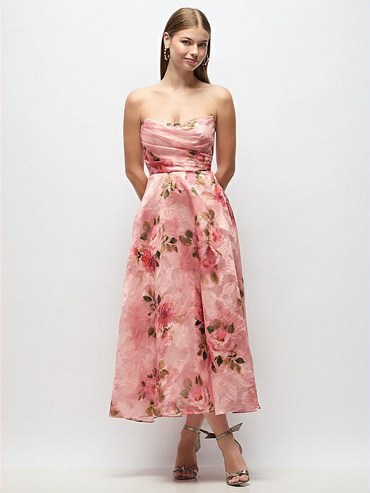 Strapless Organza Jacquard Midi Dress with Draped Cat-Eye Bodice in guava floral print