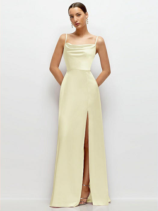 Cowl Neck Satin Maxi Dress with Adjustable Spaghetti Straps in butter yellow