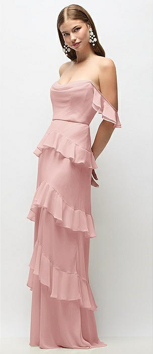 Off-the-Shoulder Cowl Chiffon Tiered Ruffle Maxi Dress with Convertible Ruffle Straps in rose
