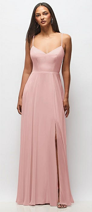 Bow-Shoulder V-Back Chiffon Gown with Front Slit in rose