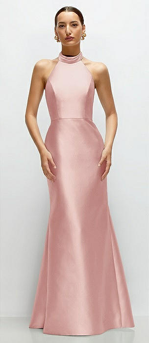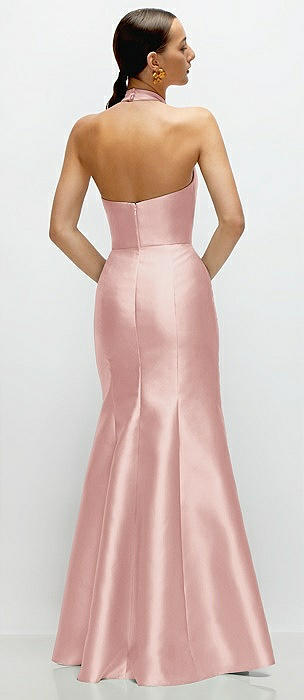 High-Neck Halter Open-Back Satin Trumpet Dress in rose