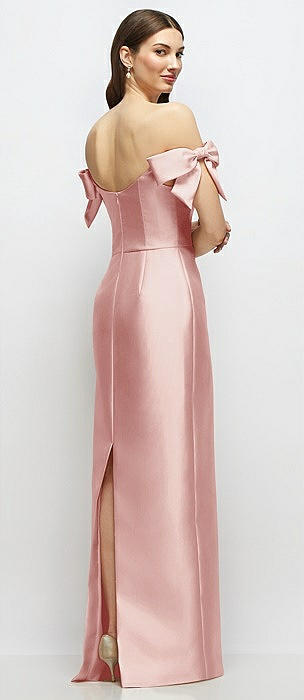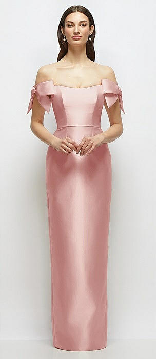 Basque-Neck Satin Column Maxi Dress with Off-the-Shoulder Bows in rose