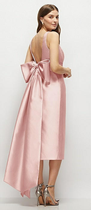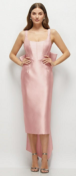 Scoop Neck Corset Satin Midi Dress with Floor-Length Bow Tails in rose