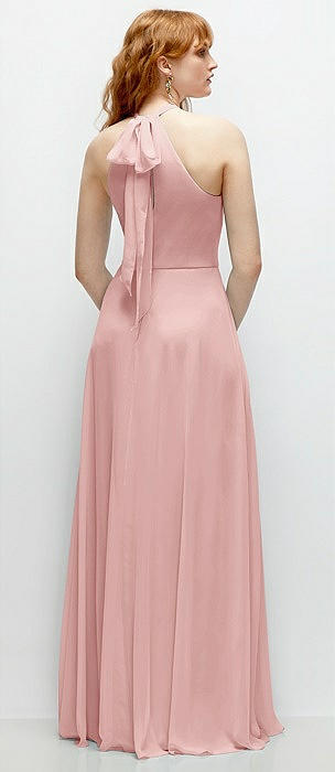Shirred Halter Chiffon Maxi Dress with Back Sash-Tie Closure in rose