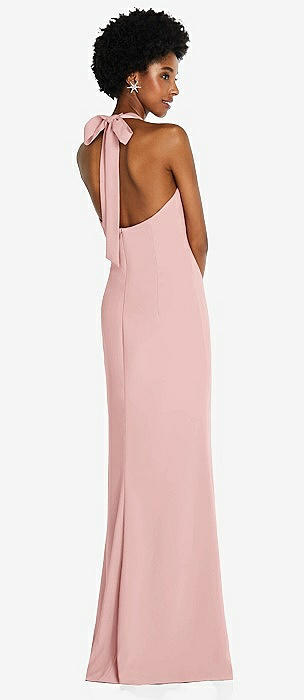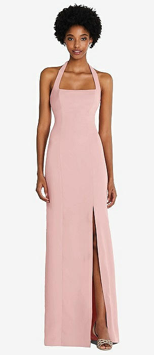 Shirred Skirt Jewel Neck Halter Dress with Front Slit in rose