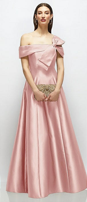Asymmetrical Bow Off-Shoulder Satin Gown with Ballroom Skirt in rose