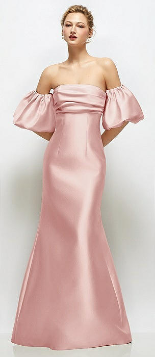 Off-the-Shoulder Puff Sleeve Satin Maxi Dress with Flared Skirt in rose