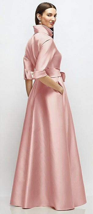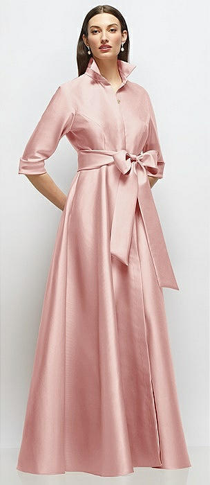 3/4 Sleeve Satin Shirt Dress Gown with Sash and Jeweled Buttons