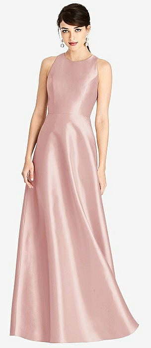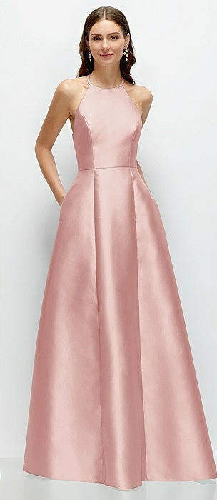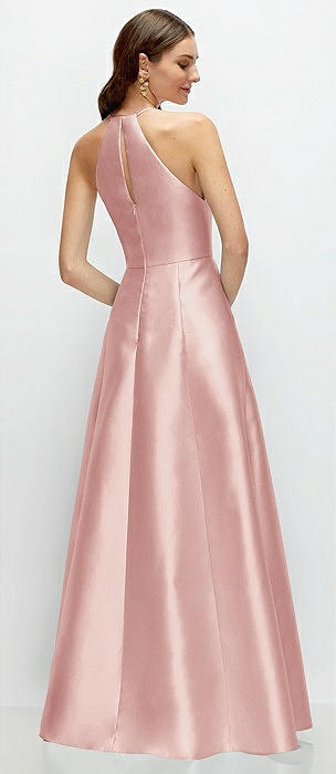 Jewel Neck Halter Full A-Line Satin Maxi Dress in rose