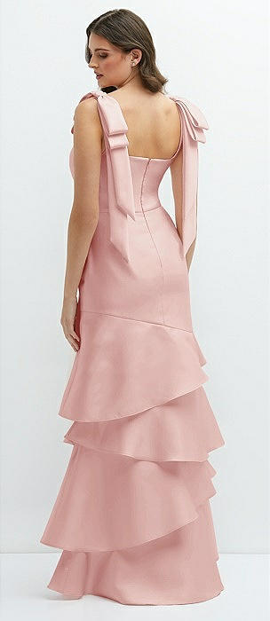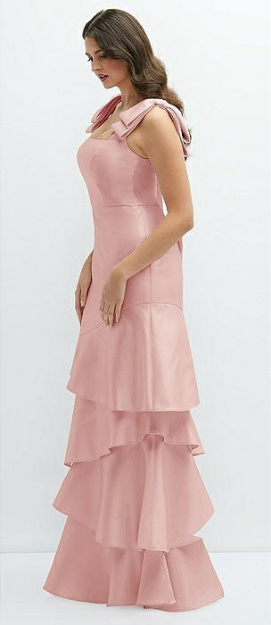 Bow-Shoulder Satin Maxi Dress with Asymmetrical Tiered Skirt in rose