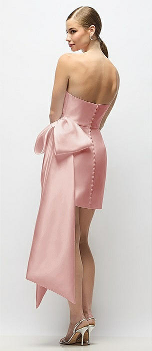 Strapless Pleated Draped Satin Mini Dress with Dramatic Long Tail Bow & Covered Buttons in rose