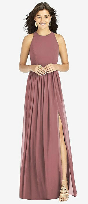 Shirred Skirt Jewel Neck Halter Dress with Front Slit